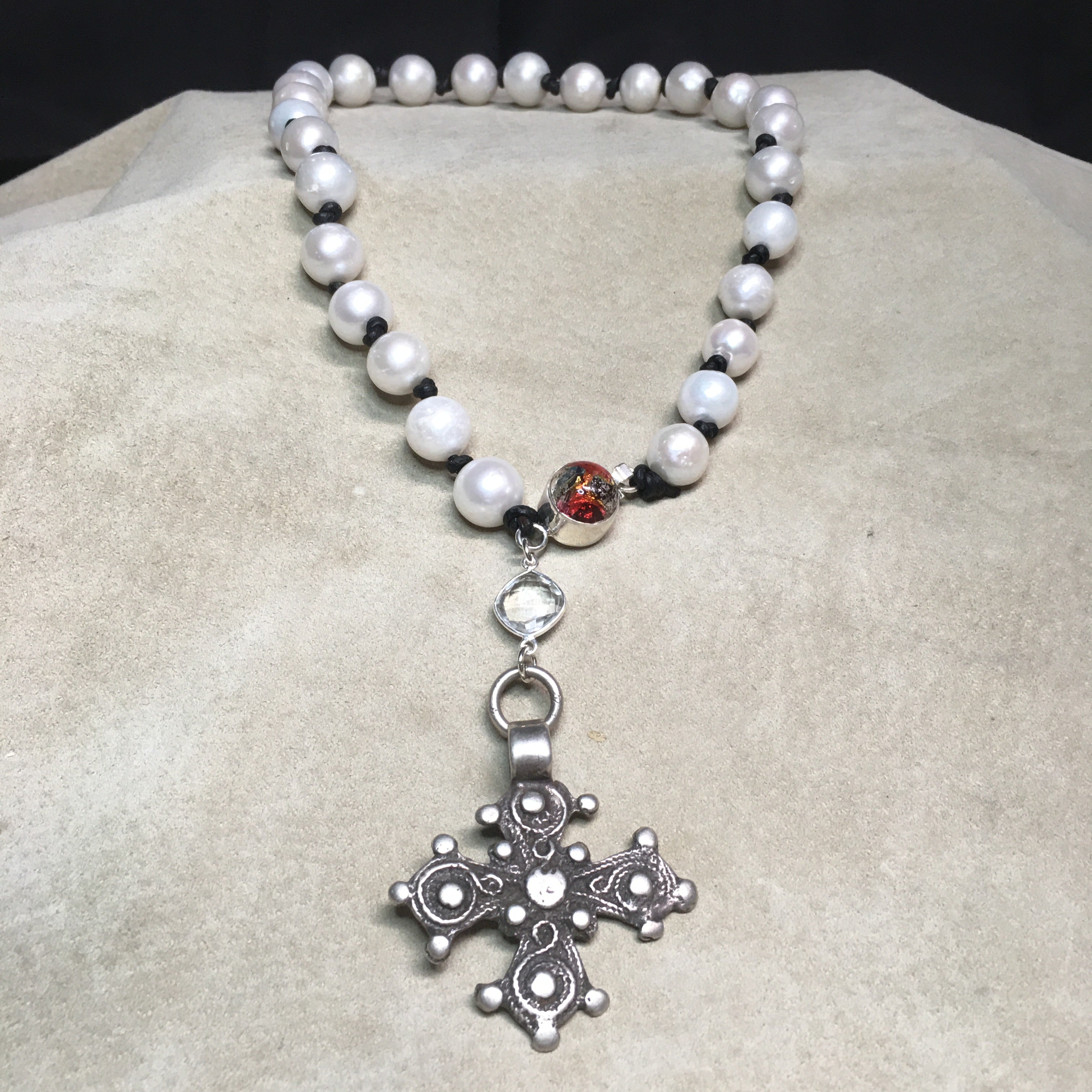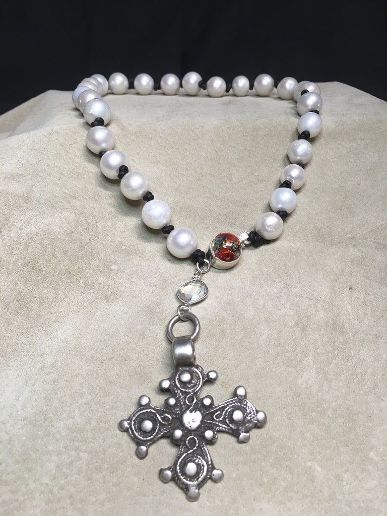 1700’s Ornate Coptic Cross with large pearl choker and antique glass clasp